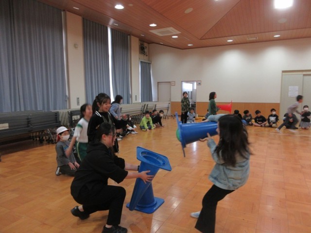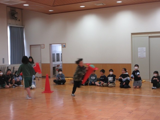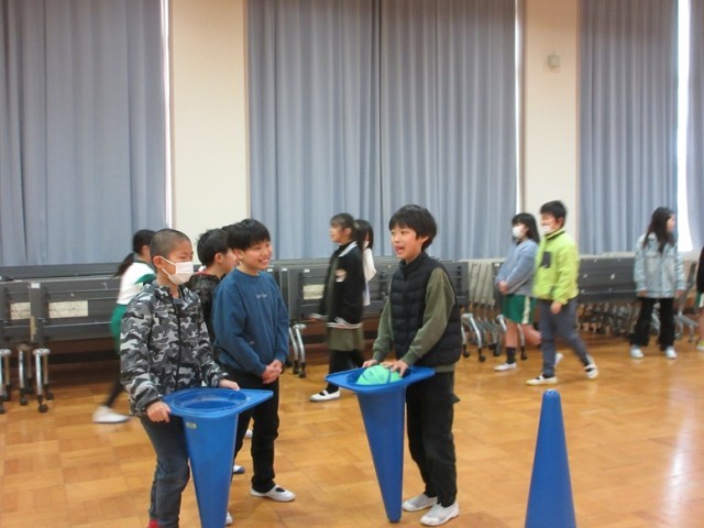 2組は、お楽しみ会です。四小レクスポで盛り上がったコーンバトンリレーで今日も再び白熱していました。作戦を考え、次のレースがはじまります!最後の日まで級友との交流を深めています。