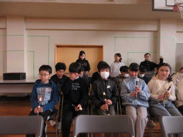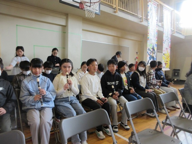いよいよ旅立ちの時、5年生の演奏に合わせて会場を後にします。見送る先生方の目にも光る物が見えます。しかし、振り向かず胸をはって歩いて行きました。