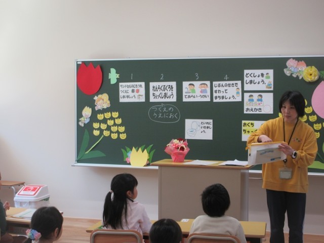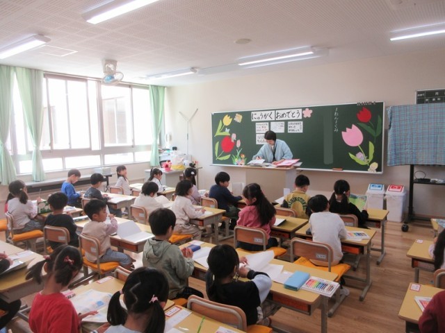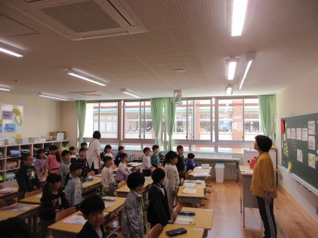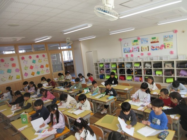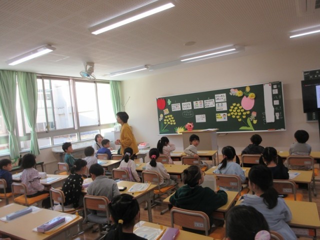 1年生は、提出物を出した後、お絵かきや読書をしています。あいさつやプリントの配布の仕方も練習しています。いろいろな小学校の生活のルールを確認しています。1年生の教室の廊下からは、天気がいいとこんなにきれいな富士山が見えます。