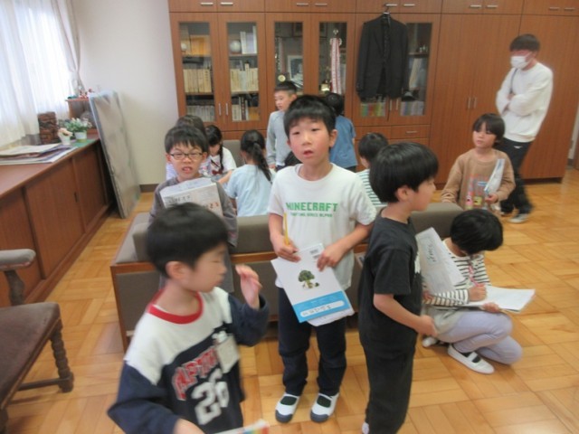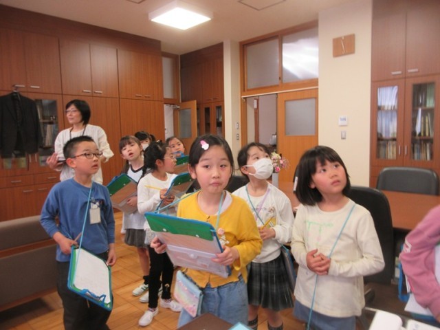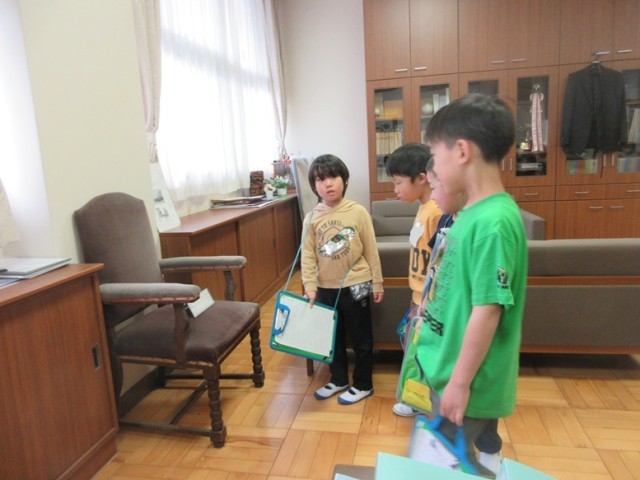 2年生が学校探検で、校長室を探検に来ました。1年生の頃も見ていたので覚えている子も多かったですが、改めて「古い椅子」に興味を示した子も多くいました。四小には、昭和5年6月1日に、昭和天皇が第四小を訪れ、おかけになった椅子が保管されています。