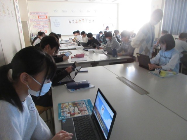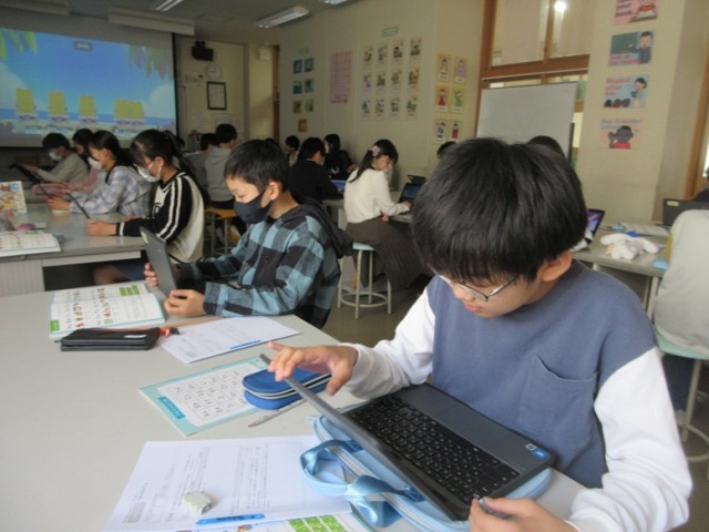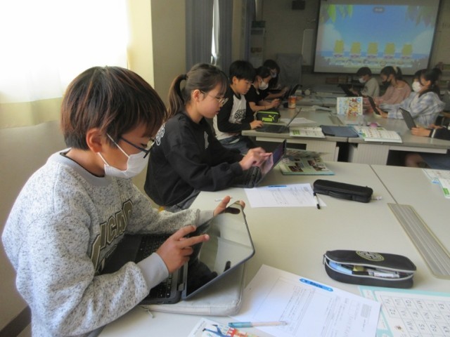 2組は、英語の学習で、カフートを使って、相手の好きな教科やスポーツを尋ねるフレーズを楽しみながら考えていました。