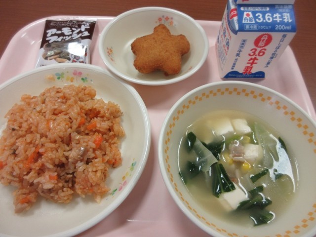 今日の給食の献立は、チキンライス、星形コロッケ、豆腐と野菜のスープ、アーモンド小魚、牛乳です。