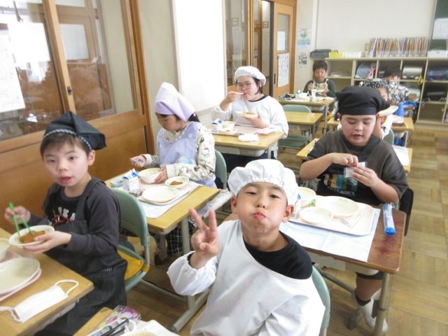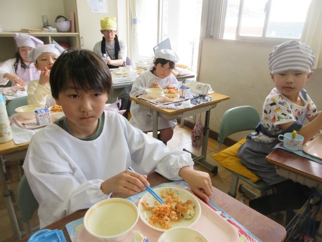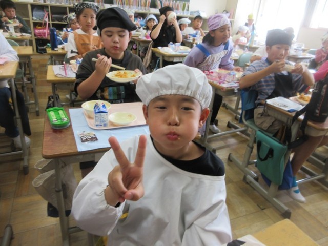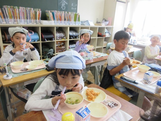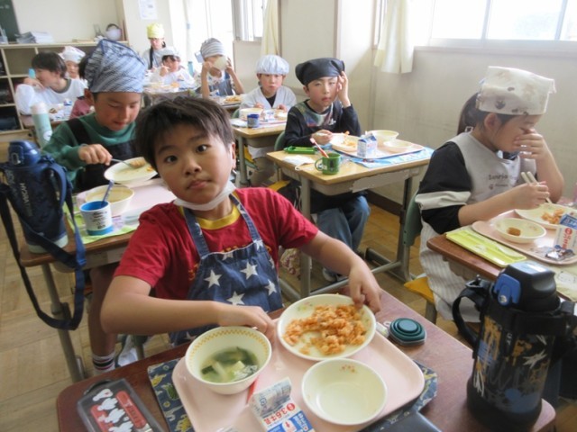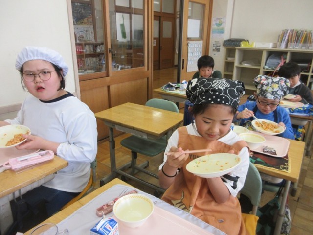 4年2組の子たちは、「これで卵ものってたらよかったのにな~」とオムライスを食べたがっていた子もいました。ちょっとそこまでは栄養のバランスを考えると今日はつけられませんでしたね~。いつかオムライスも出ると思いますよ!