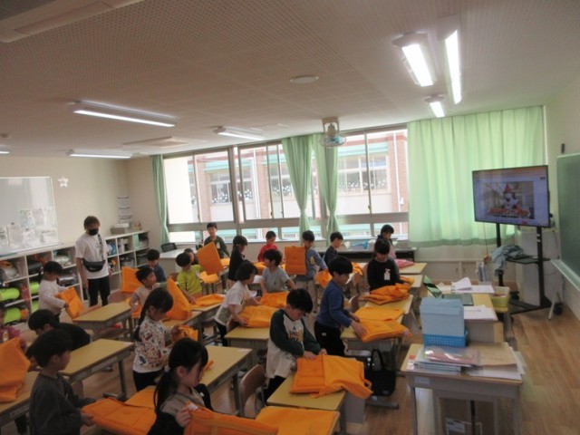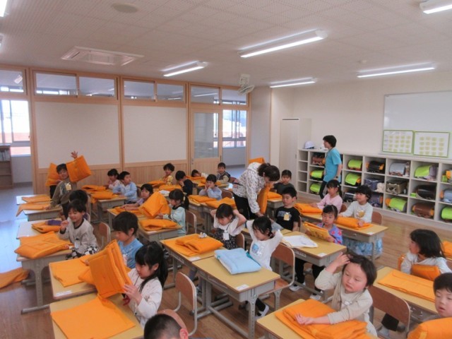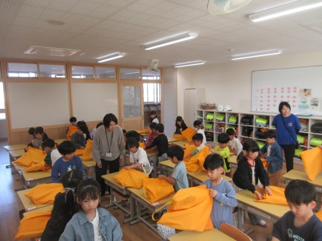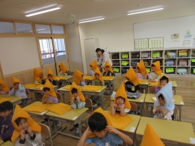 1年生は1,2組とも2時間目の地震避難訓練のためのお話を先生から聴いていました。また、幼稚園や保育園の頃使っていた防災頭巾より小学校のものは大きくなったので、そのかぶり方や片付け方も練習しました。