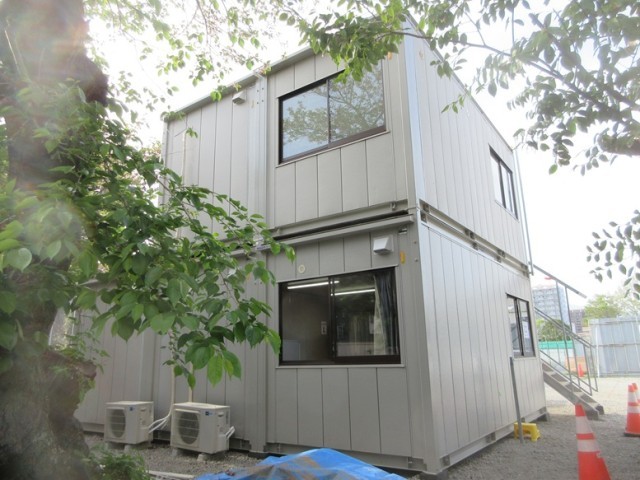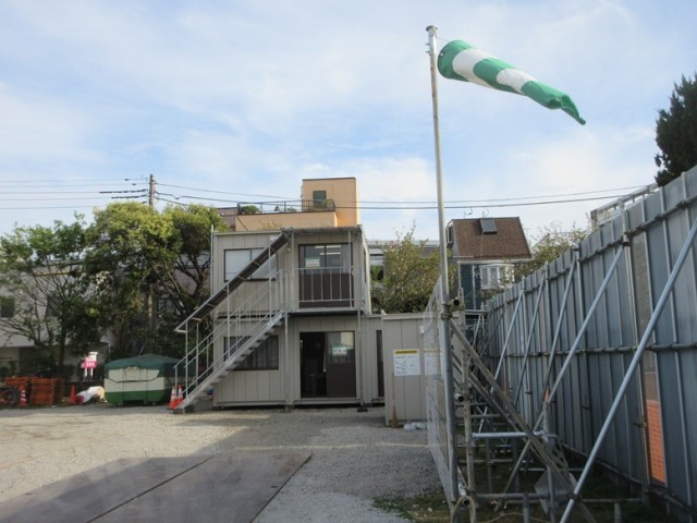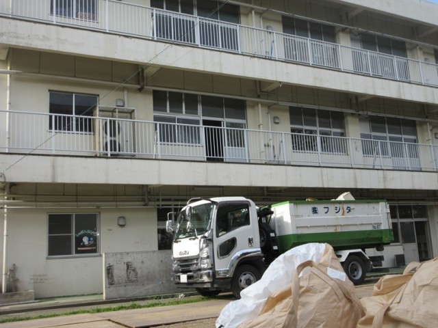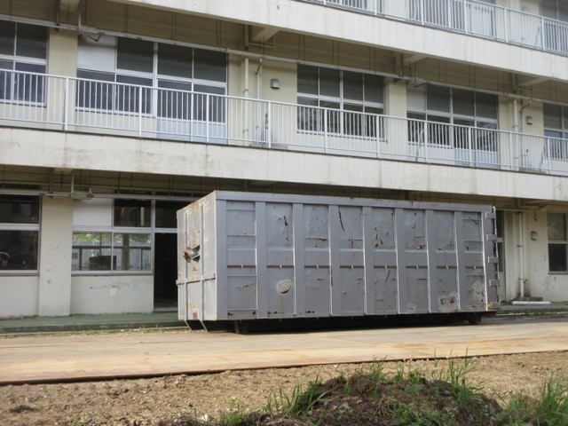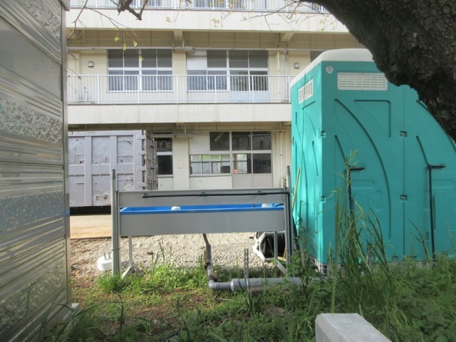 解体工事は、校舎内部をメインに行われています。騒音・振動計、簡易トイレ、仮設事務所などが建ち、大きな産廃ボックスも運び込まれています。教室内部も写真では見えないですが、大きな備品なども取り外されています。