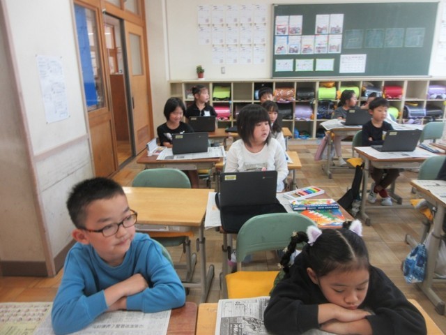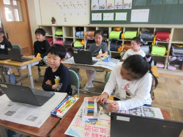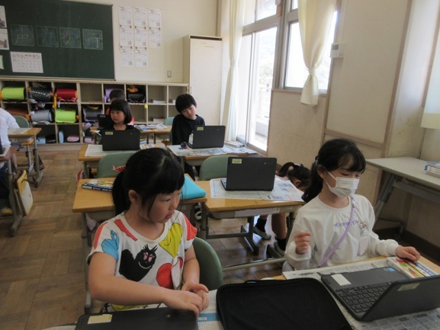 2年1組は、図工「2年生のわたし」、自画像の学習です。クロムブックのカメラを鏡の代わりにして、自分の表情をのぞき込んでします。首をかしげたリ、笑顔にしたり、見ていてとてもかわいらしかったです。