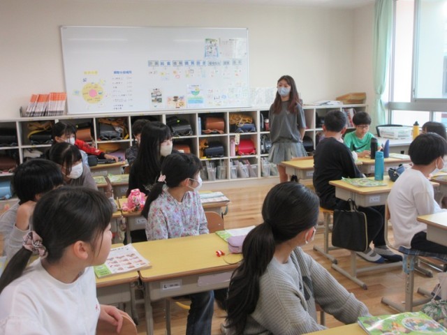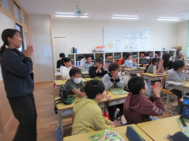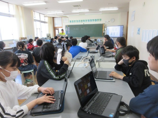 2組は、家庭科の学習です。まずは家庭科に関するコメントを入れた自己紹介です。「家庭科は調理、裁縫など全般的に得意です」と言う子や「絶望的に苦手です」と言う子もいて、教室に笑いが巻き起こっていました。みんな、得意になるといいですね!