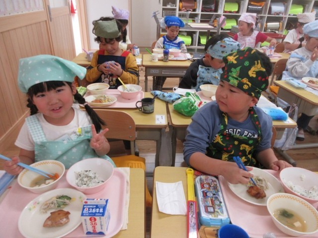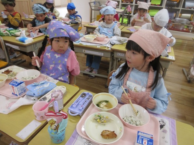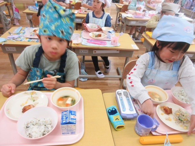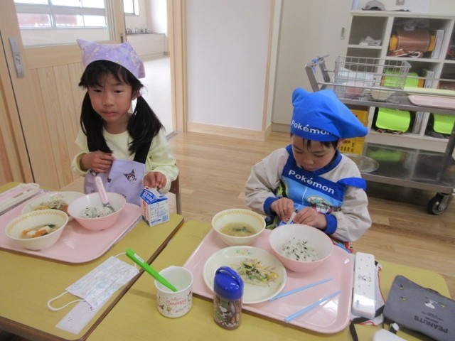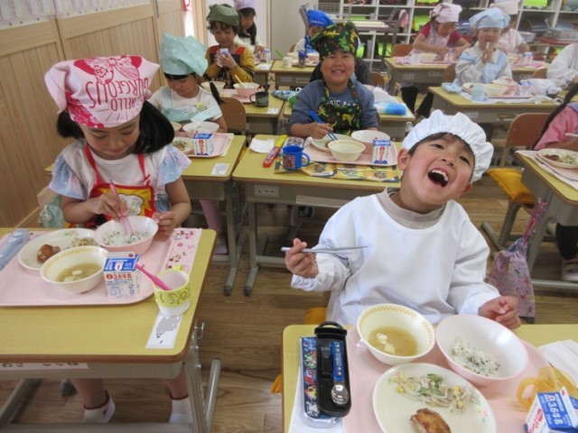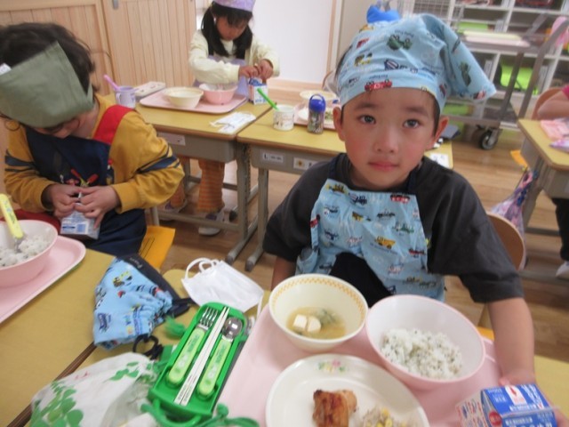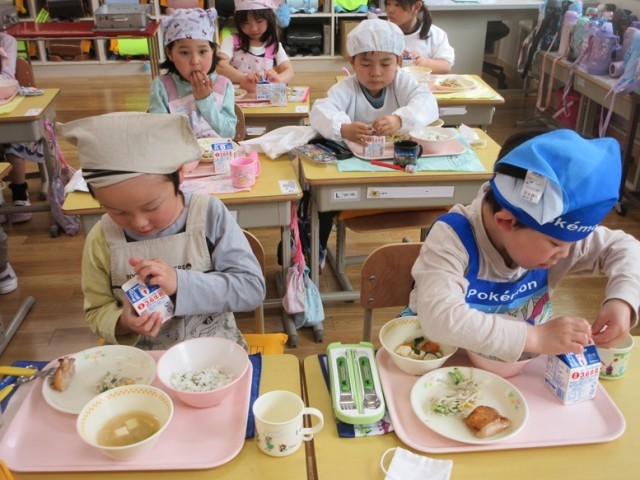 ようやく準備が整い、いただきます!ところが牛乳パックの開け方に苦戦しました。基本的にはストローを使わないので早くなれるといいですね。「おいしい!」という言葉がたくさん出ています。