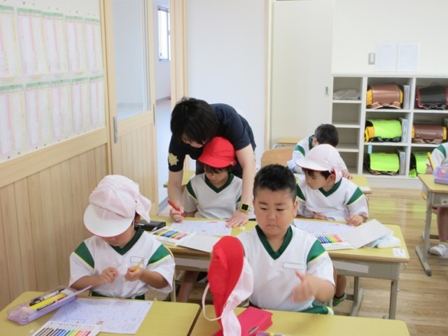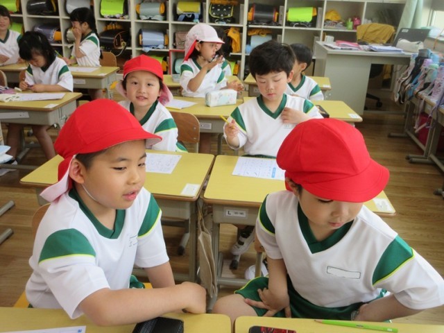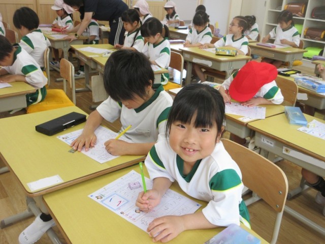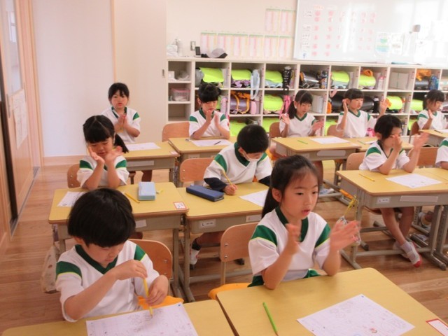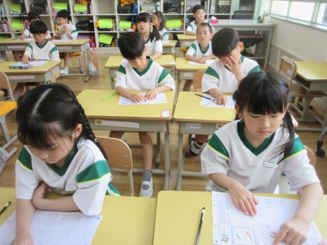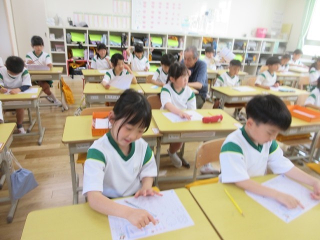 1年生は、国語のひらがな「い」の学習です。「い」の付く言葉を拍手しながらリズムよく話したり、プリントに書いたりしながら楽しく学習しています。