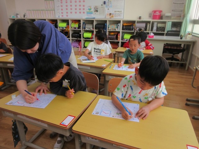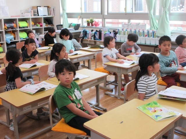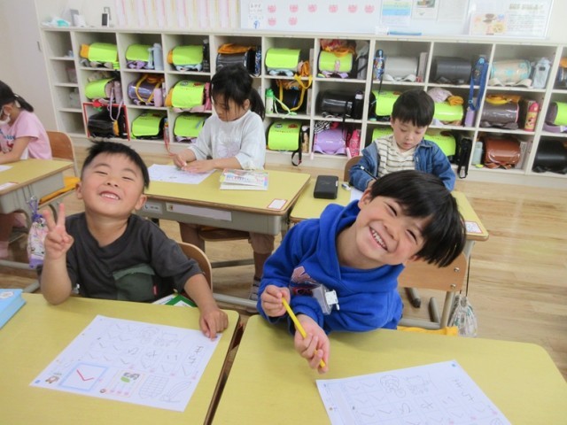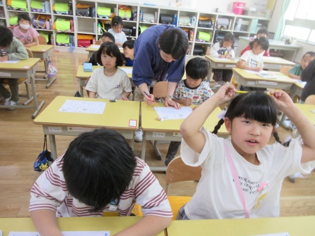 1年生は国語の学習です。1組は、ひらがな「へ」の学習です。へや、へい、へちまなど「へ」のつく言葉も探しています。一文字一文字丁寧に書いているところを先生も一人一人見届けます。