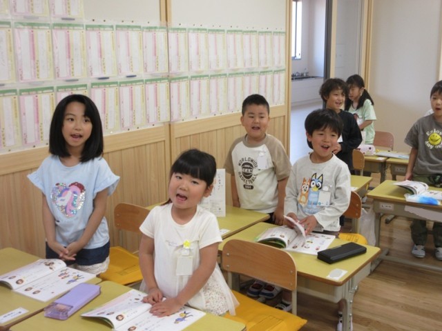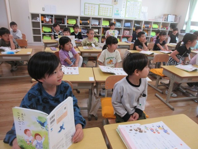 2組は、「あいおうえおのうた」をたけのこ読みで動作をつけながら読んでいます。自分の選んだところが来たら、にょきっと立って音読します。楽しみながら音読しています。