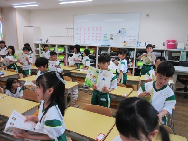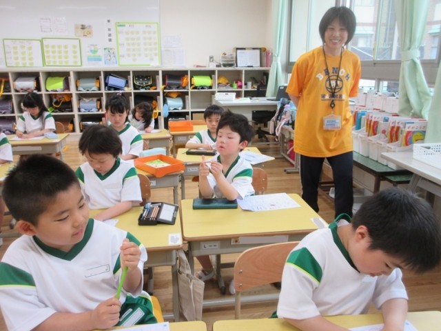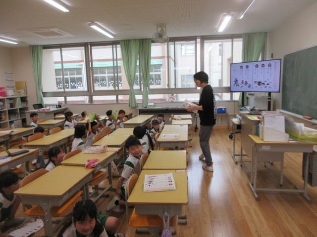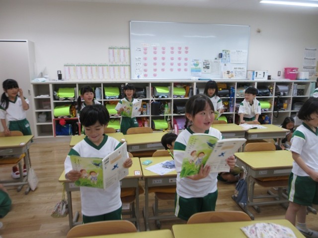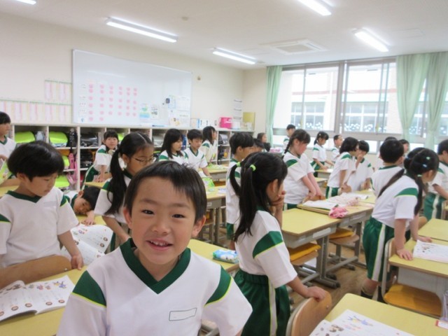 1年1組は、国語「あいうえおのうた」の学習です。今日も動きのダイナミックな「たけのこ読み」をしています。みんな、立ったり座ったりしながら楽しく元気な声で音読しています。