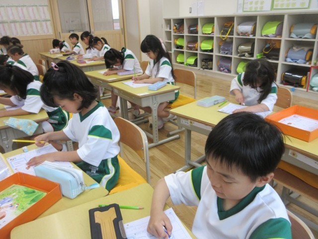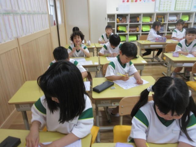 2組は、国語ひらがな「り」の学習です。りす、くり、りんごなど「り」のつく言葉も考えています。