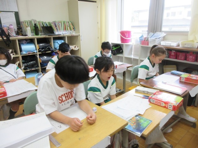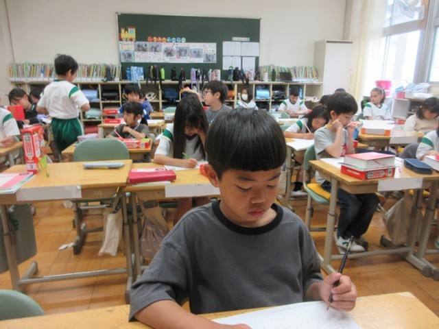 2組は、ローマ字の学習です。4線を意識して「AIUEO」「aiueo」と大文字、小文字で書く練習をしていました。