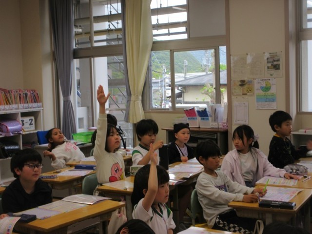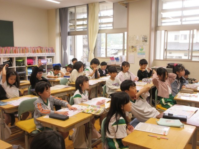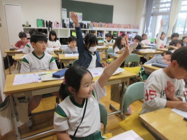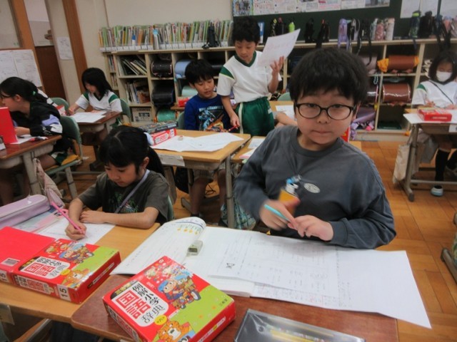 3年1組は、国語「国語辞典の使い方」の学習です。どんな順番で見出し語が並んでいるのかを、実際に使いながら考えています。