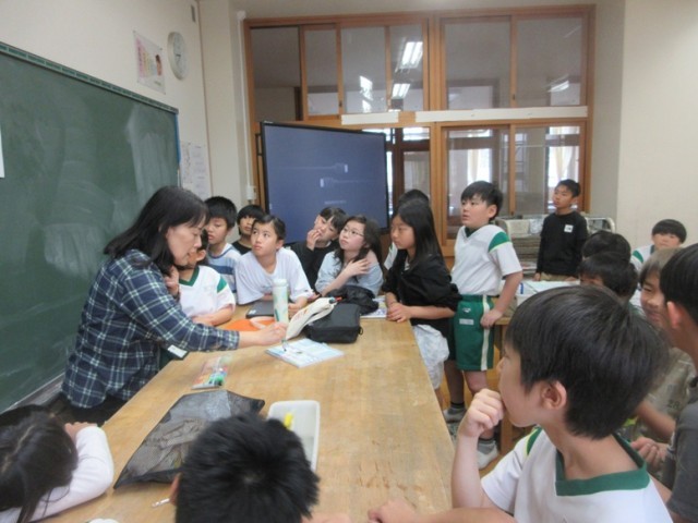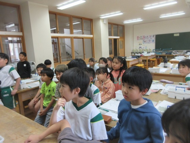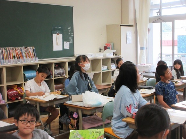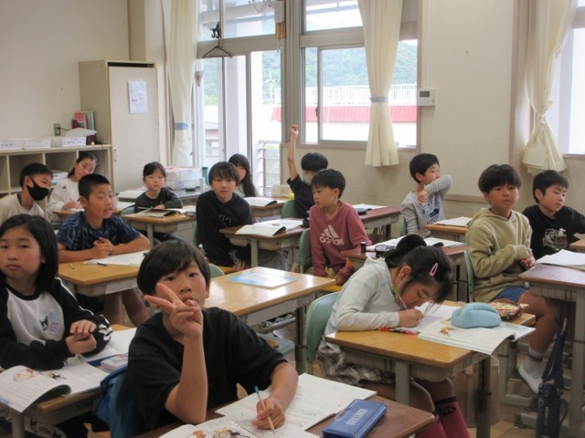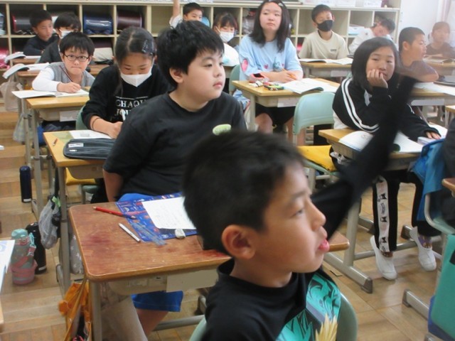 2組は、国語「こわれた千の楽器」の学習です。楽器の気持ちがどのように変化していったのかをみんなで考えています。子供たちからの発表に「すばらしい!」と先生。