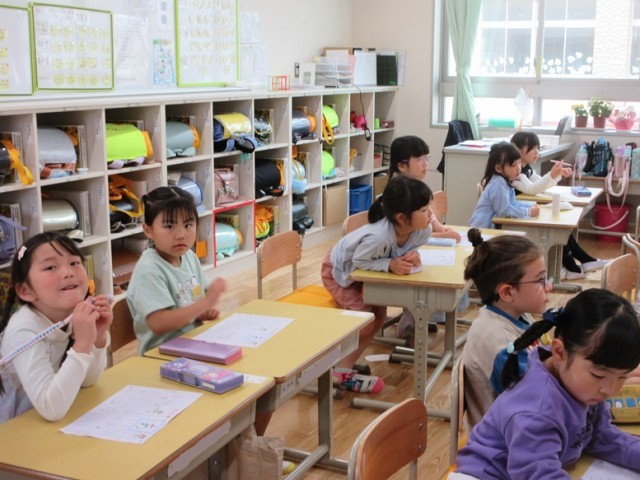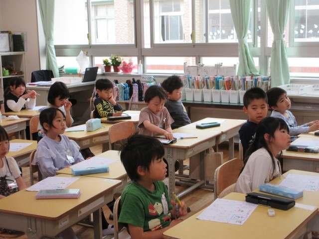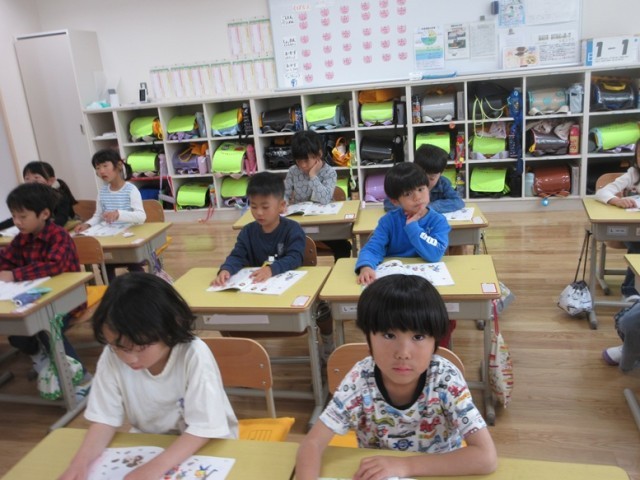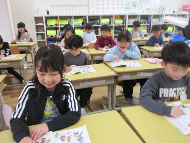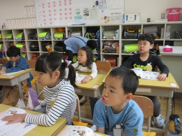1年生は、1,2組とも国語の授業です。1組は、「あいうえおのうた」の学習で、読むときにお口の開け方に気をつけて読む練習をしています。みんな、大きく開けたり閉じたりしながら元気よく音読をしています。