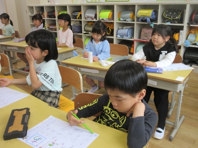 2組は、ひらがな「あ」の学習です。はじめてひらがなの3画の文字に挑戦です。形の取り方が難しいかな?みんな、がんばって練習しています。