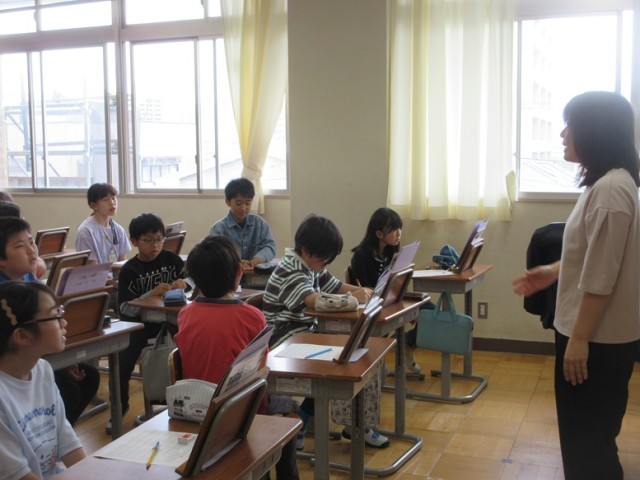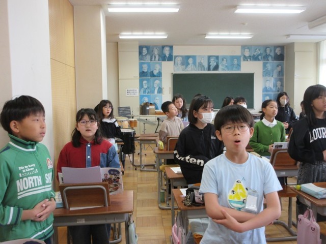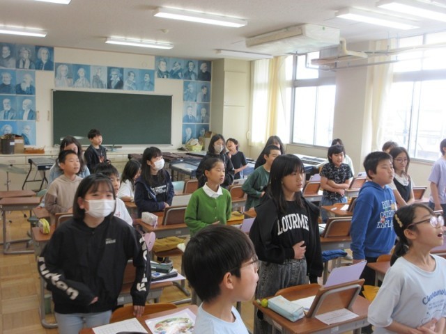 2組は、音楽です。腹式呼吸をしながらどのくらいきれいな声を出せるか、時間を計りながらチャレンジしています。息を出し切り、「ふ~」と一息しています。発声練習をこれからも頑張っていきましょうね!