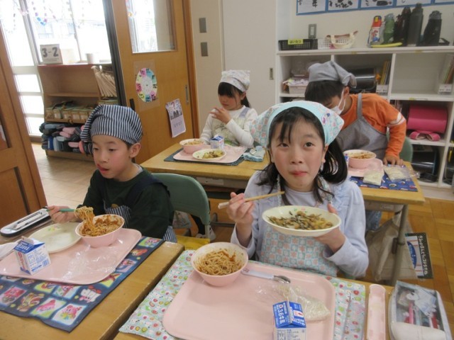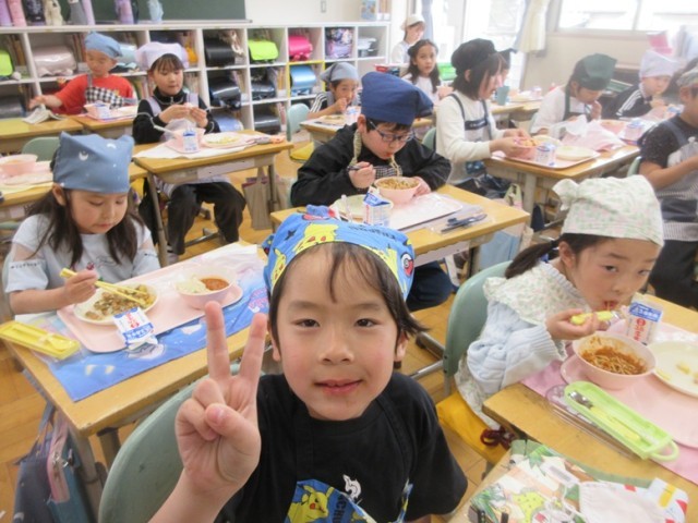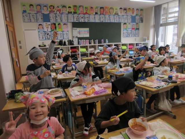 3年2組では、牛乳のおかわりじゃんけんをしていました。とても盛り上がっています。幸運の女神は誰に微笑んだのでしょうか。