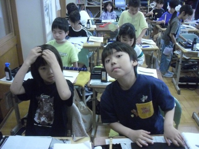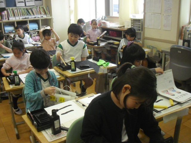3年生は、初めて毛筆に挑戦します。まずはこぼさないで!