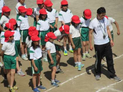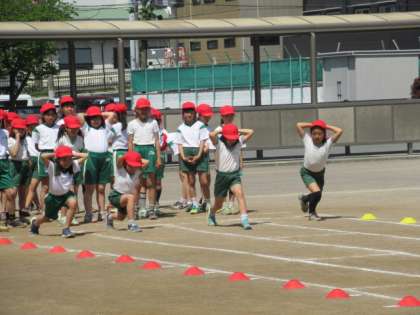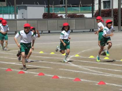 短距離走の授業です。大股で5歩歩いてから、ダッシュします。