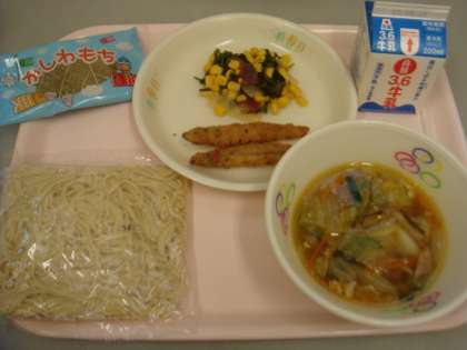 今日の給食は「タンメン・きびなごフライ・こんにゃくと海藻のサラダ・柏餅・牛乳」でした。