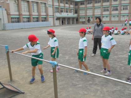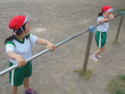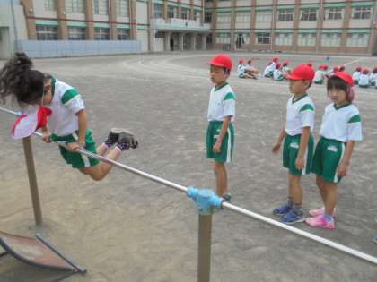 鉄棒の逆上がりができるようになってきました。補助具なしでもできるように練習しています!