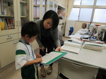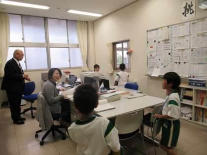 2年生の案内で、1年生が学校探検をしています。職員室や事務室にも、かわいい探検隊が来ています。
