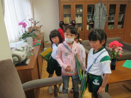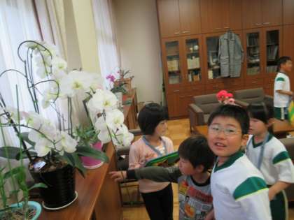 昭和5年、天皇陛下がお座りになられたいすは、校長室に大切に保管されています。じっくり見ていってね。きれいなお花や水晶の原石、南極の石もありますよ。