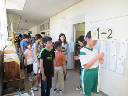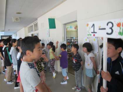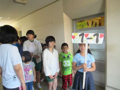 6年生に手をつないでもらって、1年生が入場準備を始めました。プラカードを持つのは、担当の5年生です。