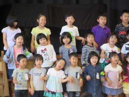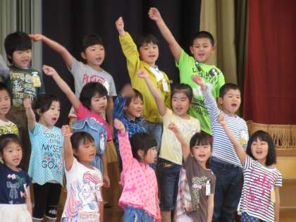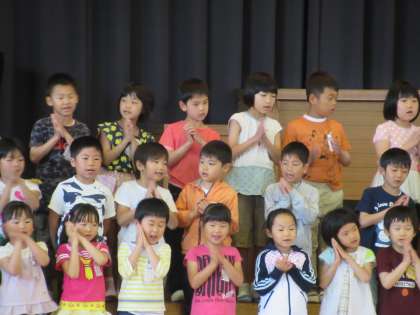 1年生が、お礼の歌を歌ってくれました。「どきどきどん1年生」を振りつきで、元気いっぱいに歌いました。