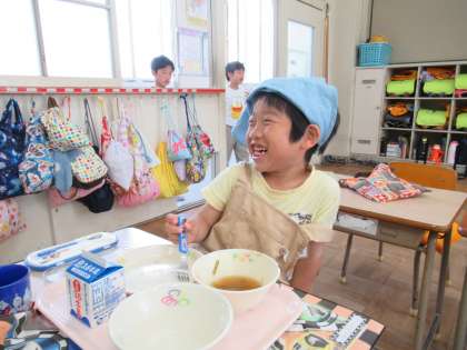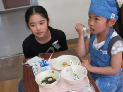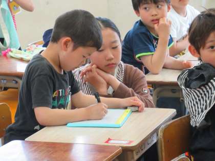 6年生のお姉さんたちが、寄り添うように、お手伝いに来てくれていました。みんな、膝を折って、1年生と同じ目線で接しています。