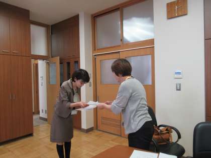 本日、本年度第1回目の学校評議員会を開き、評議員の皆様に委嘱状をお渡ししました。
