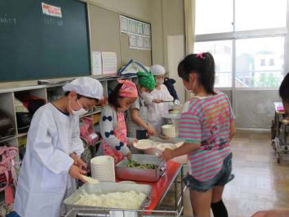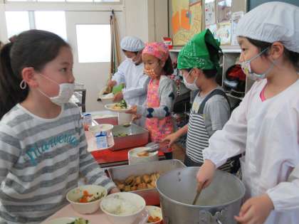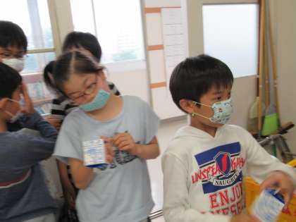このクラスも、整然と配膳しています。牛乳パックを気にしているのは、番号が書いてあるからなんです。子どもたちは、おみくじ感覚で見ているようです。
