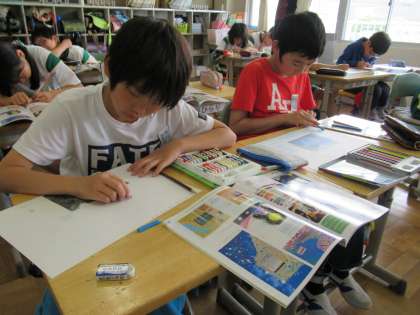1枚の写真から、イメージを広げて絵を描いていました。海の底へ、宇宙へ、世界が広がっていきます。