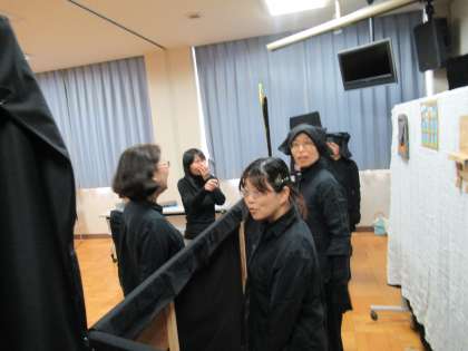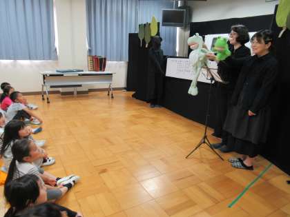 人形劇団「けろころぱん」。10年以上も前に、四小の保護者の皆さんで結成されました。今は、「かつての保護者」となった方が多いのですが、毎年、子どもたちのために人形劇を見せてくださっています。