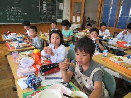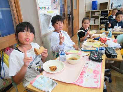 スープのおかわり希望者多数。好き嫌いしないで野菜もよく食べる、よい子たちです。
