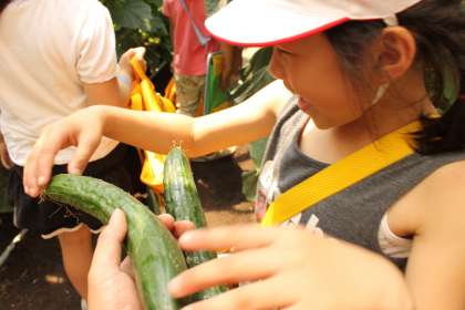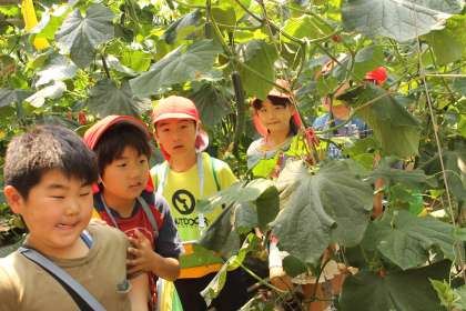生活科で野菜を育て始めた子ども達が、野菜名人のビニールハウスを見学させてもらいました。ハウスいっぱいに実っているきゅうりに大興奮です。お店には並ばない大きなきゅうりも見せてもらえました。