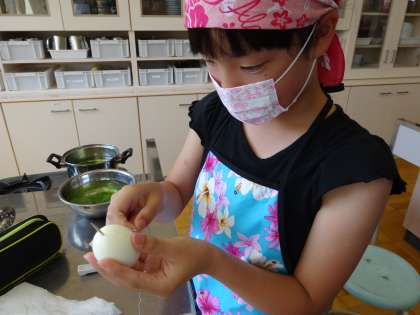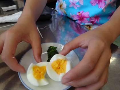 つまようじと糸を組み合わせて作ったものを使い、ゆでたまごの切り方を工夫しています。