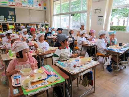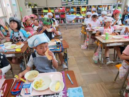 今日は、牛乳アレルギーの子どもも食べられるように、栄養教諭の先生が豆乳を使ったシチューを考えてくれました。とってもおいしくできていました。