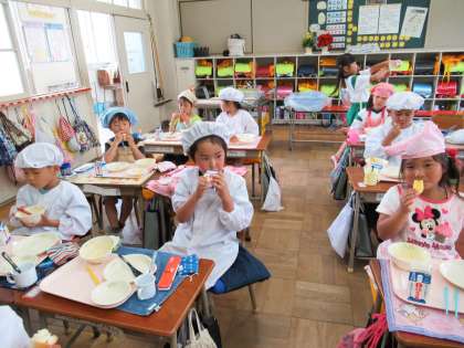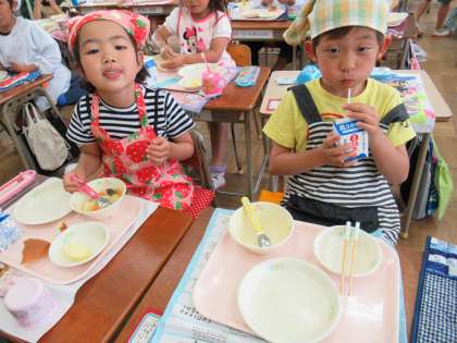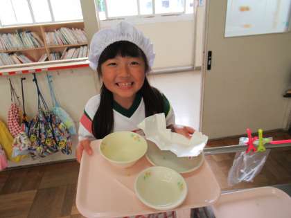 今日は、牛乳アレルギーの子どもも食べられるように、栄養教諭の先生が豆乳を使ったシチューを考えてくれました。とってもおいしくできていました。