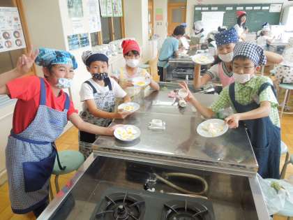 5/25(木)、初めての調理実習に挑戦しました。班によって、固ゆでのものや少し半熟のものがあり、色とりどりのきれいなゆで卵ができました。各家庭から持ってきた塩の味にも違いがあり、楽しめたようです。