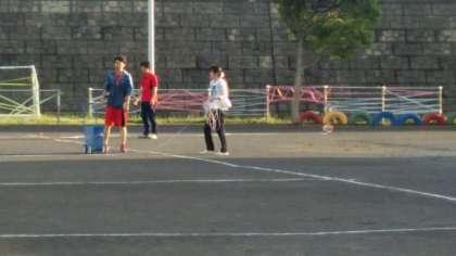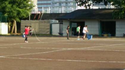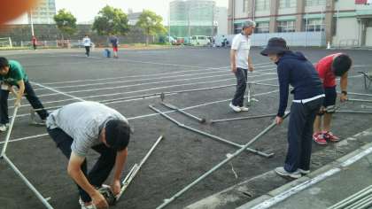 先生方、5時半集合で、頑張っています。校庭が少しぬかるんでいるので、土を入れました。予定どおり運動会を開催します。