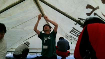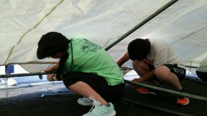 テントをたてるのは、大仕事! みんなで、力を合わせます。