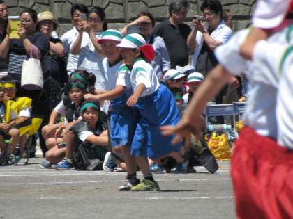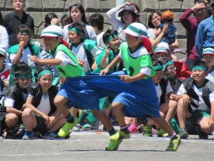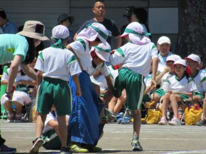 デカパンでリレーをしました。勝敗を分けたのは、パンツの着脱だったようです。