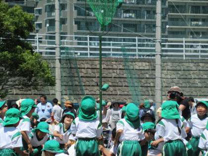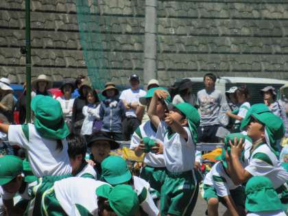 玉入れです。入りそうでなかなか入らない…。でも、1年生、がんばりました。