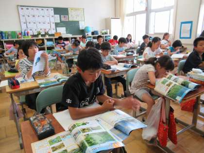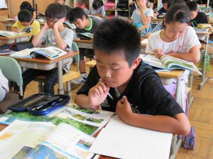 資料を使って、平地と山間部の傾斜地での農業の違いを調べていました。一人学びが、真剣に行われていました。