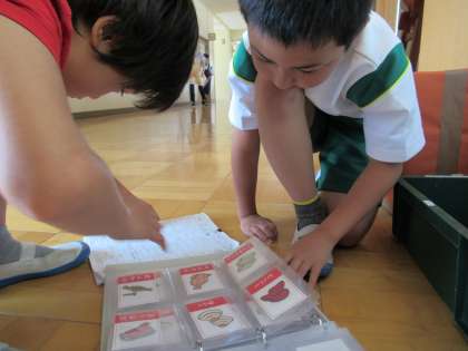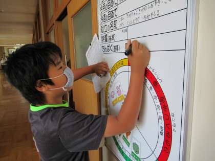 委員会活動の様子です。今日の献立の栄養価を記入したり食材の仲間分けをしたりして、みんなに知らせてくれています。
