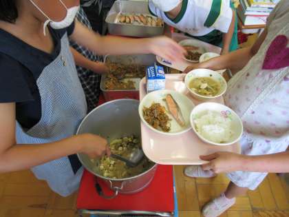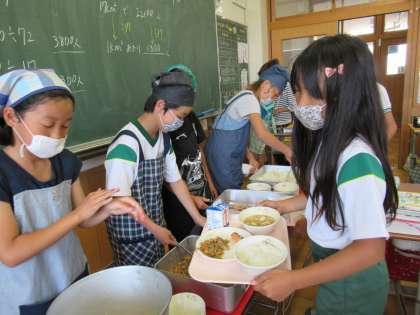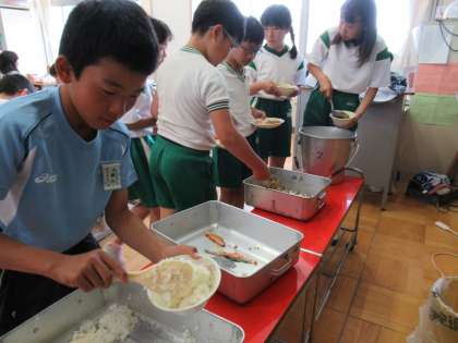 今日の給食当番さんは、ご飯とみそ汁を置く場所まで気を配りながら、配膳していました。ここでも、おかわりをする子がたくさんいました。頼もしいですね。